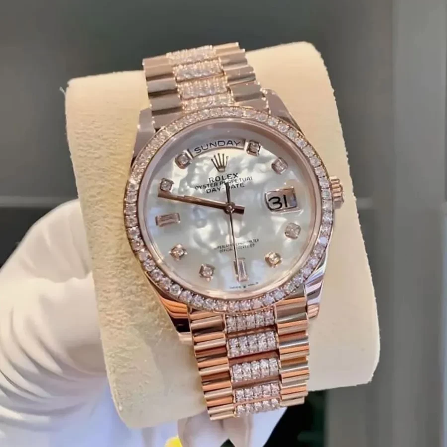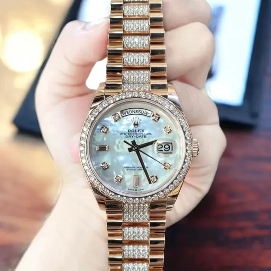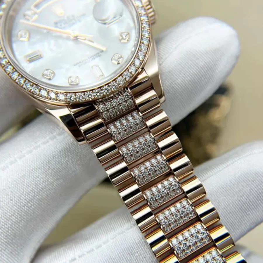 Đặc biệt, bên cạnh những chi tiết cổ điển, chiếc đồng hồ này cũng thế hiện tinh thần hiện đại với việc kết hợp giữa chất liệu vàng 18K cùng với rất nhiều viên kim cương được nạm kín trên mặt số, viền bezel cho đến dây đeo. Ngoài ra, mang đến một sự thu hút tự nhiên vào mặt số đồng hồ, Rolex 128345RBR MOP có vạch số là những viên đá cùng bộ kim thanh mảnh, sang trọng.