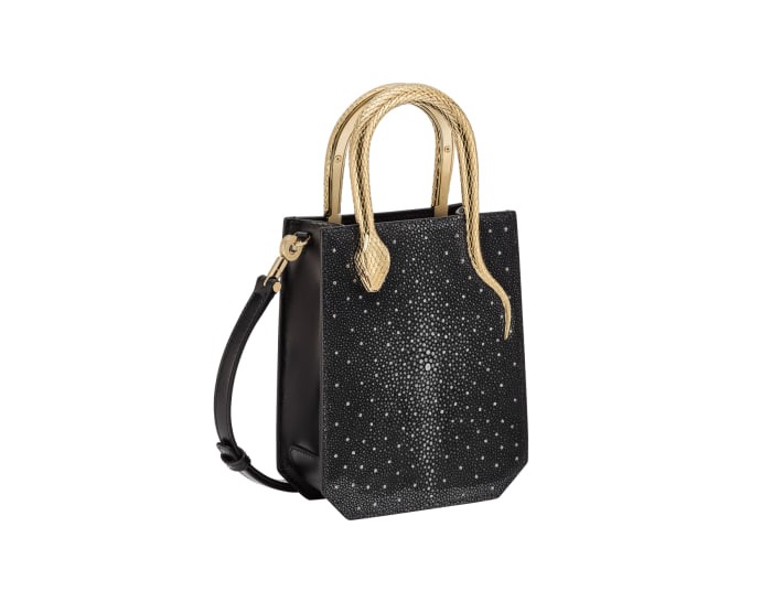 The SERPENTINE series mini tote bag is made of black diamond glitter pearl fish leather. The sides are made of soft and wear-resistant black urban calfskin. The texture is exquisite and extraordinary, sparkling like pavé diamonds, and the diamonds hand-set on it. The particles complement each other. This piece features two snake-shaped handles, embellished with engraved scales and red enamel eyes. The design is inspired by the bold and uninhibited SERPENTI series antique collection necklaces of the 1960s. It cleverly combines the crisp vertical shape with jewelry element details, which is reminiscent of See the graceful and agile posture of the spirit snake. Featuring a leather shoulder strap, this stylish bag features a single open compartment, an internal spliced pocket and an internal metal plaque engraved with the Bulgari logo. 13 X 17.5 X 5.5 cm - 5.1 X 6.9 X 2.2 inches. made in Italy.